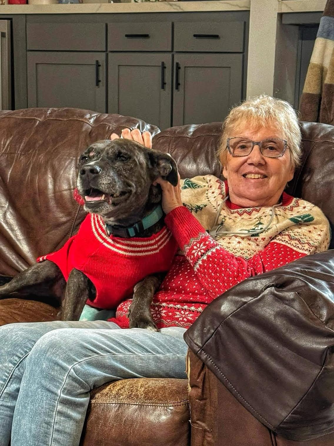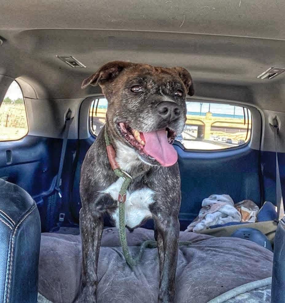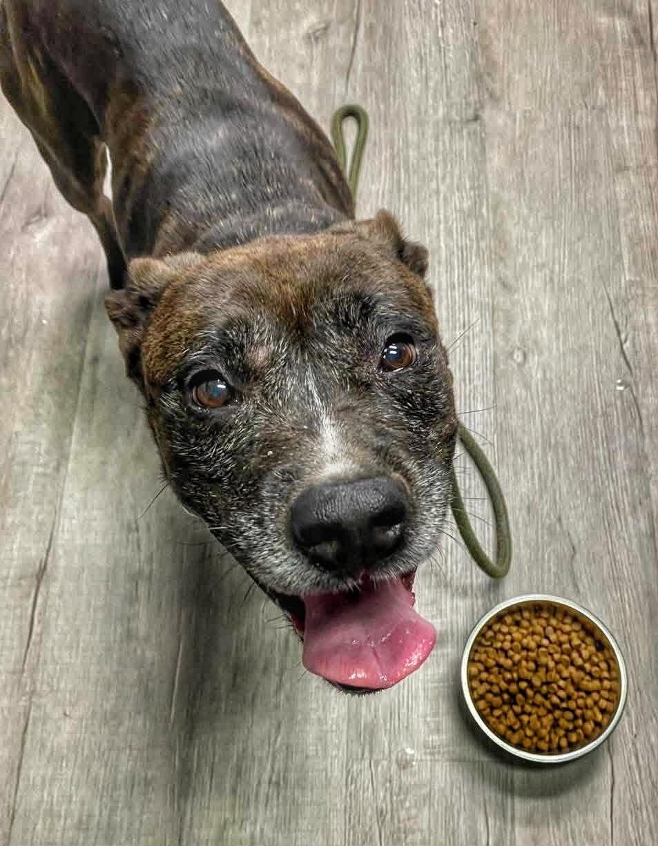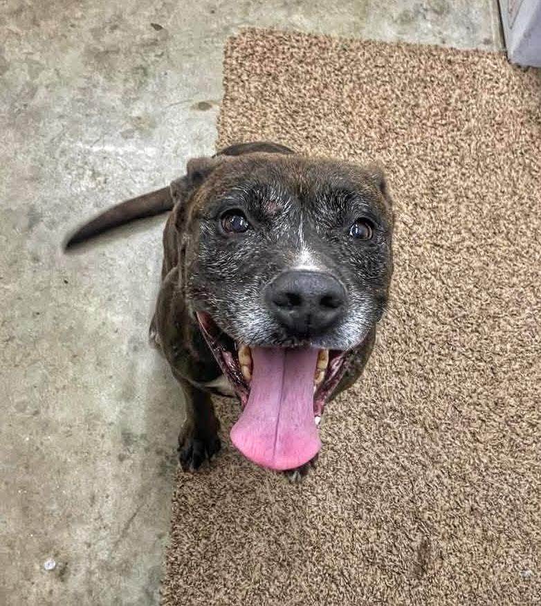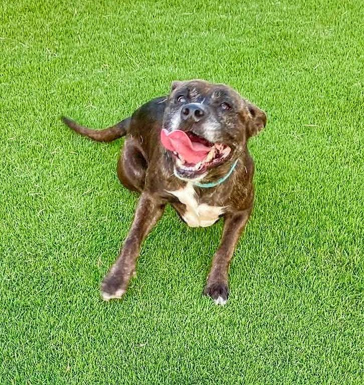 Age is just a number and Harriet’s here to wiggle her cute little brindle self right in to your lap and heart! Yes she’s absolutely a lap buddy but the couch or bed will do too. She’s not picky. Just being with her humans is the thing that makes Harriet the happiest girl alive. And that’s what she’s looking for humans she can shower with love. She’s a lover of all the things…..every person she’s ever met, other dogs she’s just a good, sweet girl looking for the perfect retirement home. Shes chill. Basically a couch potato sort of dog who loves belly rubs and won’t destroy your stuff. We just know we can find the perfect home for a dog like Harriet. Who wouldn’t love a happy, smiley senior pittie. We know we do!