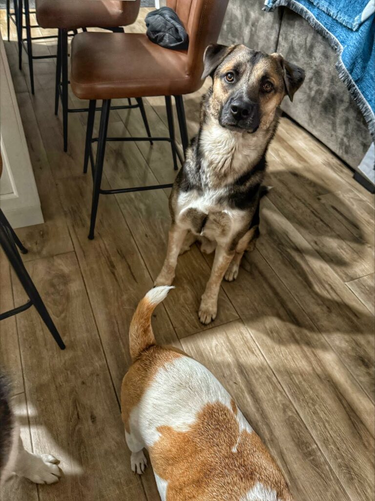 Rocky is thriving in foster care. He’s quickly bonded to the canine buddies in the home and fully trusts his foster family happily following them from room to room. He is high energy pup and would do best in an active household with at least one other confident, fun, playful dog. Rocky is both house trained and crate trained, and he loves being indoors where he feels safe and part of the family. While he’s still timid with a lead/leash, he’s getting more comfortable and is making steady progress, especially using a harness. He’s incredibly smart and wants to connect and please so badly. If you’re ready to give Rocky the time, patience, and love he deserves, he’ll reward you with unending loyalty. He’s not just looking for a home he’s looking for a family. Could you give him the home and family he’s never had?